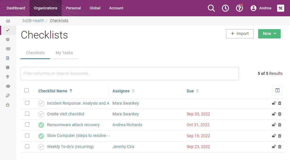 - Die Berechtigung zum Anzeigen und Abschließen von Checklisten wird durch Ihre IT Glue-Kontoberechtigungen festgelegt. Sie können auf die gleichen Checklisten wie in IT Glue zugreifen.