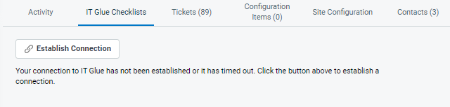 Die Registerkarte IT Glue-Checklisten wird auf den Registerkarten für Extras der Seite Firmendetails angezeigt. Unter dieser Registerkarte können Sie die Verbindung zwischen Ihren Autotask- und IT Glue-Benutzerkonten herstellen.