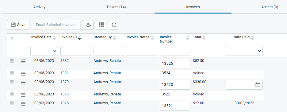 Die Registerkarte Rechnungen wird auf den Registerkarten für Extras der Seite Firmaangezeigt. Sie enthält die Rechnungshistorie für die ausgewählte Firma. Um die Seite zu öffnen, nutzen Sie den/die Pfad(e) im vorstehenden Abschnitt Sicherheit und Navigation.