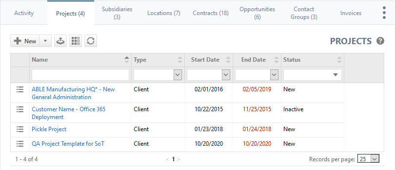 Die Registerkarte Projekte wird auf den Registerkarten für Extras der SeiteFirmendetails angezeigt. Auf dieser Registerkarte können Sie vorhandene Projekte für die Firma anzeigen und verwalten und neue erstellen. Um die Seite zu öffnen, nutzen Sie den/die Pfad(e) im vorstehenden Abschnitt Sicherheit und Navigation.