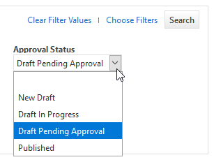 Dies erleichtert es Benutzern, ihre eigenen Entwürfe zu suchen, und für Genehmiger, Elemente zu suchen, die einer Genehmigung bedürfen. Um einen Eintrag zu suchen, wählen Sie einen der folgenden Genehmigungsstatus aus: