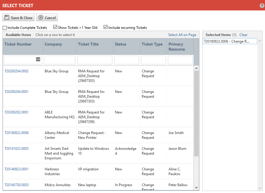 - Klicken Sie auf Speichern & Schließen, um das/die ausgewählte(n) Ticket(s) mit dem aktuellen Ticket bzw. der aktuellen Verkaufschance zu verbinden.