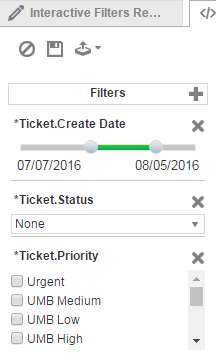 Mithilfe dieser Registerkarte können Sie einfache interaktive Filter für Datenfelder im Bericht einrichten. Der Benutzer kann diese Filter auf die HTML-Berichtsausgabe anwenden, nachdem der Bericht generiert wurde. Damit können Sie einen Bericht erstellen und für das gesamte Vertriebsteam veröffentlichen, und jeder Benutzer, für den der Bericht veröffentlicht ist, kann dann die vorkonfigurierten Filter anwenden, um die für ihn relevanten Daten anzuzeigen.