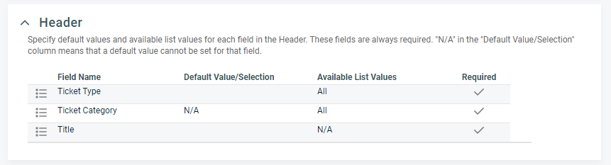 Der Abschnitt Kopfzeile enthält eine Liste der Felder, die für alle Rubriken für dieses Objekt angezeigt werden. Sie erscheinen oben im Hauptbereich, wenn die Rubrik angewandt wird. Bei einigen Feldern können Sie Standardwert/-auswahl konfigurieren und verfügbare Listenwerte beschränken.