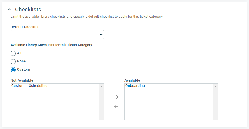 Um die verfügbaren Optionen einzuschränken, klicken Sie auf das Optionsfeld Benutzerdefiniert. Die Bereiche Nicht verfügbare Listenwerte und Verfügbare Listenwerte für diese Ticketrubrik werden aktiv.