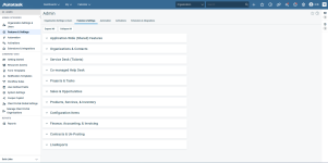 Auf dieser Registerkarte können Sie Funktionen in Autotask PSA aktivieren, die ursprünglich in der Benutzeroberfläche ausgeblendet sind. Siehe Aktivierungen. |